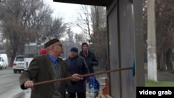 Скамейки и железный корпус остановки Асылбек Анарбаевич моет холодной водой. Причина - в этом районе киргизской столицы горячей воды нет. Зимой, когда совсем холодно, иногда он греет воду для мытья на газе.