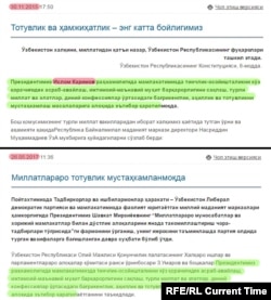 Между этими текстами – полтора года. Общее у них одно: авторы обоих материалов восхваляют мультикультурализм и толерантность в Узбекистане. В первом тексте это оценивается как результат "мудрого руководства Ислама Каримова", во втором – "успех Шавката Мирзиёева".