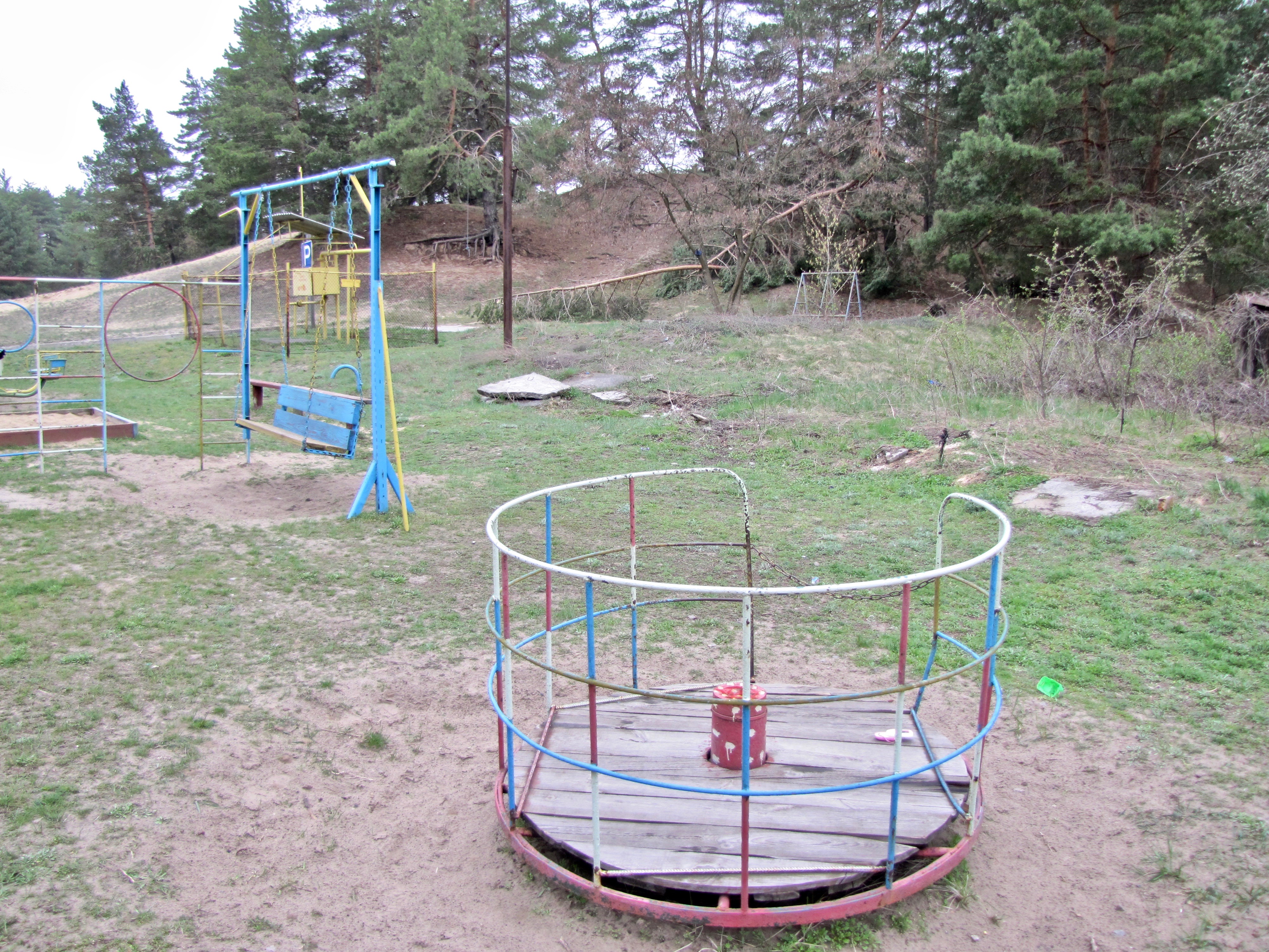 Апокалиптическая картина дополняется звуковым рядом – далеким лаем собак и пением петухов. Пройдя на звук по натоптанной тропинке несколько сотен шагов, за огромными соснами неожиданно можно обнаружить два жилых пятиэтажных дома.