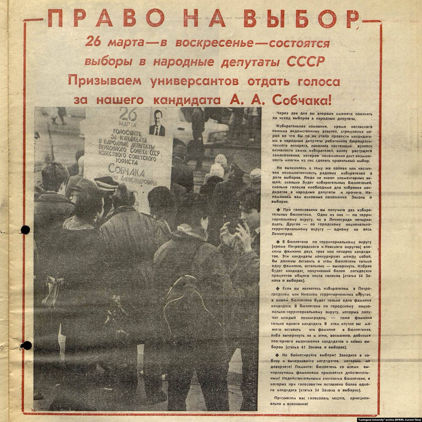 "У нас на кафедре долгое время еще потом хранился целый чемодан фотографий профессора Собчака, – комментировал Дмитрий Медведев. – Это были черно-белые снимки, отпечатанные кустарным способом, которые мы расклеивали [перед выборами] по всему Васильевскому острову".