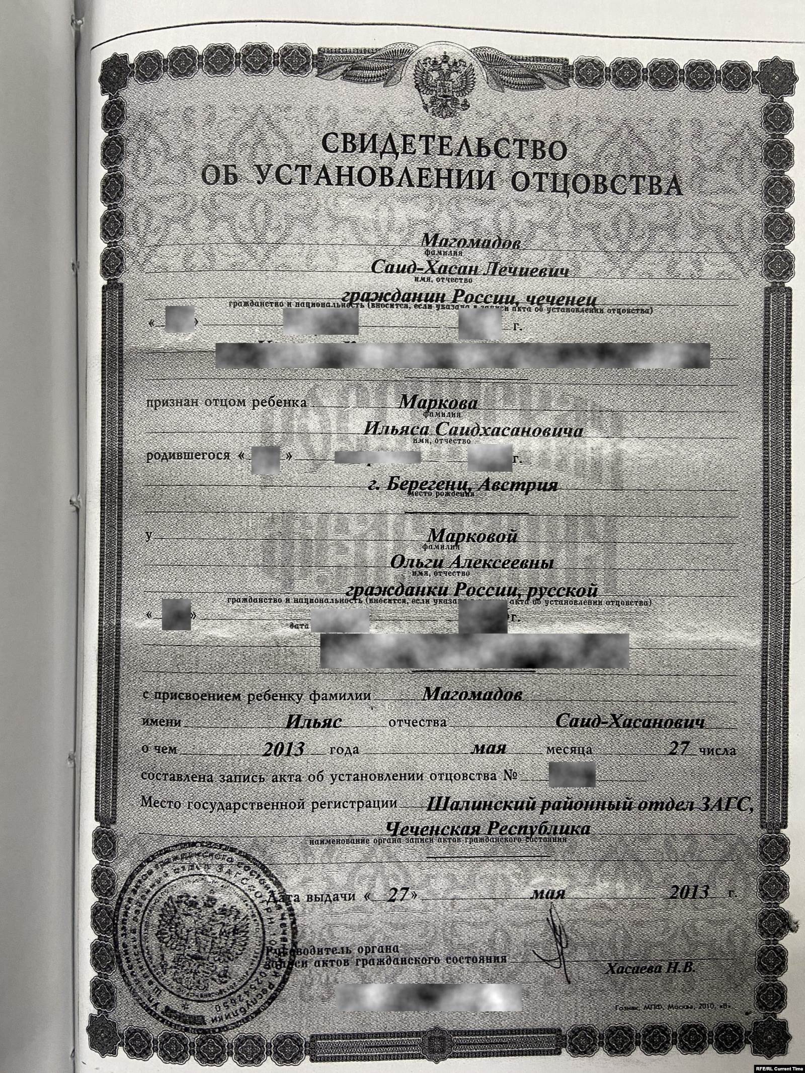 Магомадов значится отцом детей в австрийских свидетельствах о рождении, они в этом документе записаны на его фамилию. Когда же Ольга решила в Австрии сделать детям российское гражданство, то Саид-Хасан отказался заходить в посольство, поскольку официально имел статус беженца, и ему нельзя было появляться на территории Российской Федерации. Оформляя детям российское гражданство, Ольга записала их на свою фамилию. В российских свидетельствах о рождении детей она – единственный их родитель, в графе отец стоит прочерк. Но в Чечне он, говорит Ольга, подделал документ о признании отцовства.