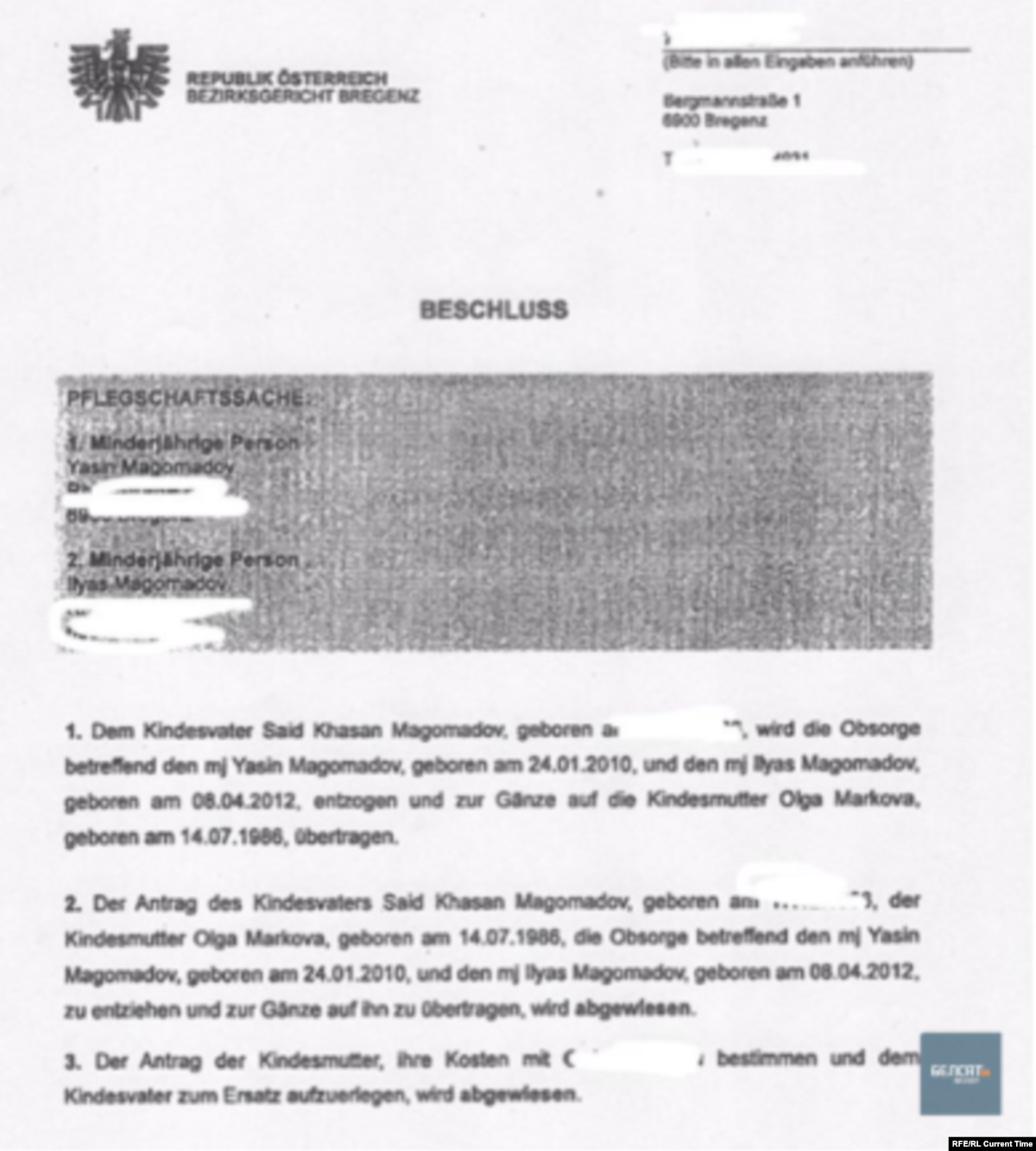 12 августа 2014 года Ольга Маркова подала в австрийский суд на лишение Магомадова родительских прав. Через два дня, 14 августа, ее просьба была удовлетворена.